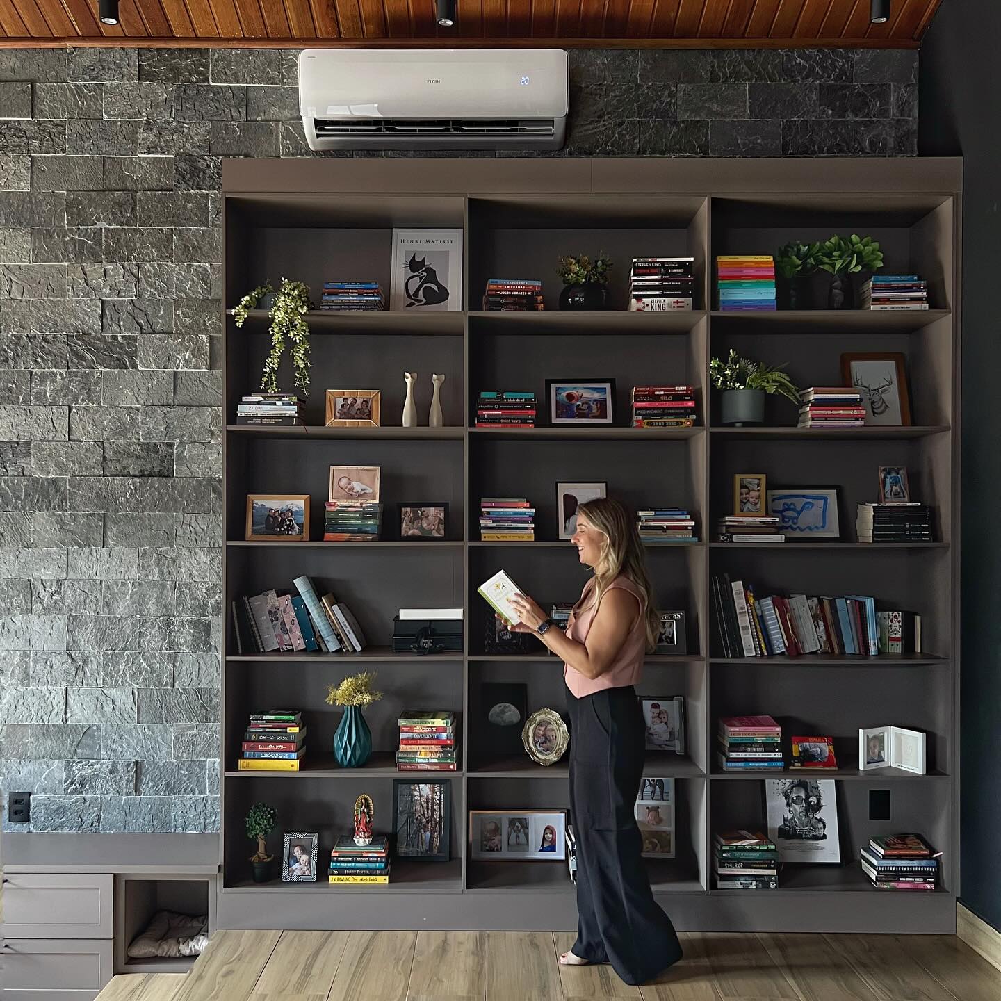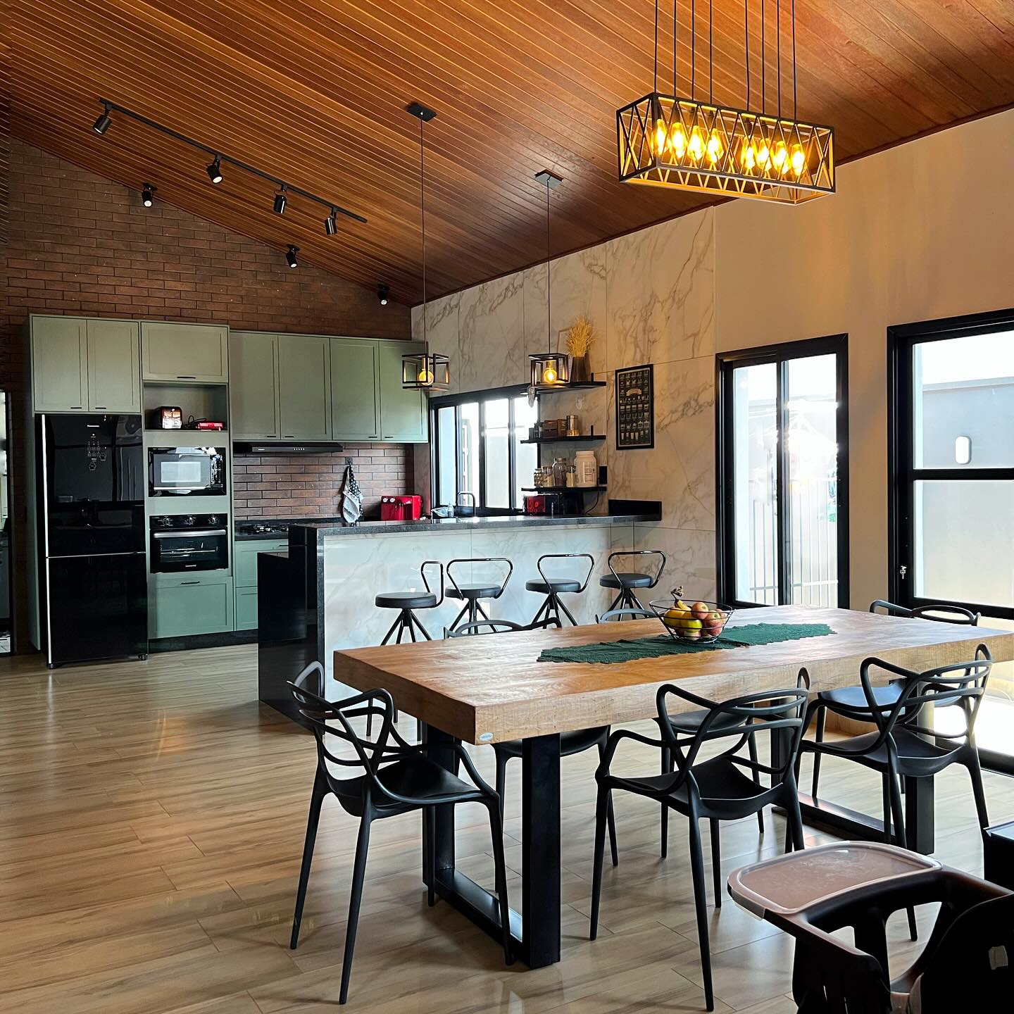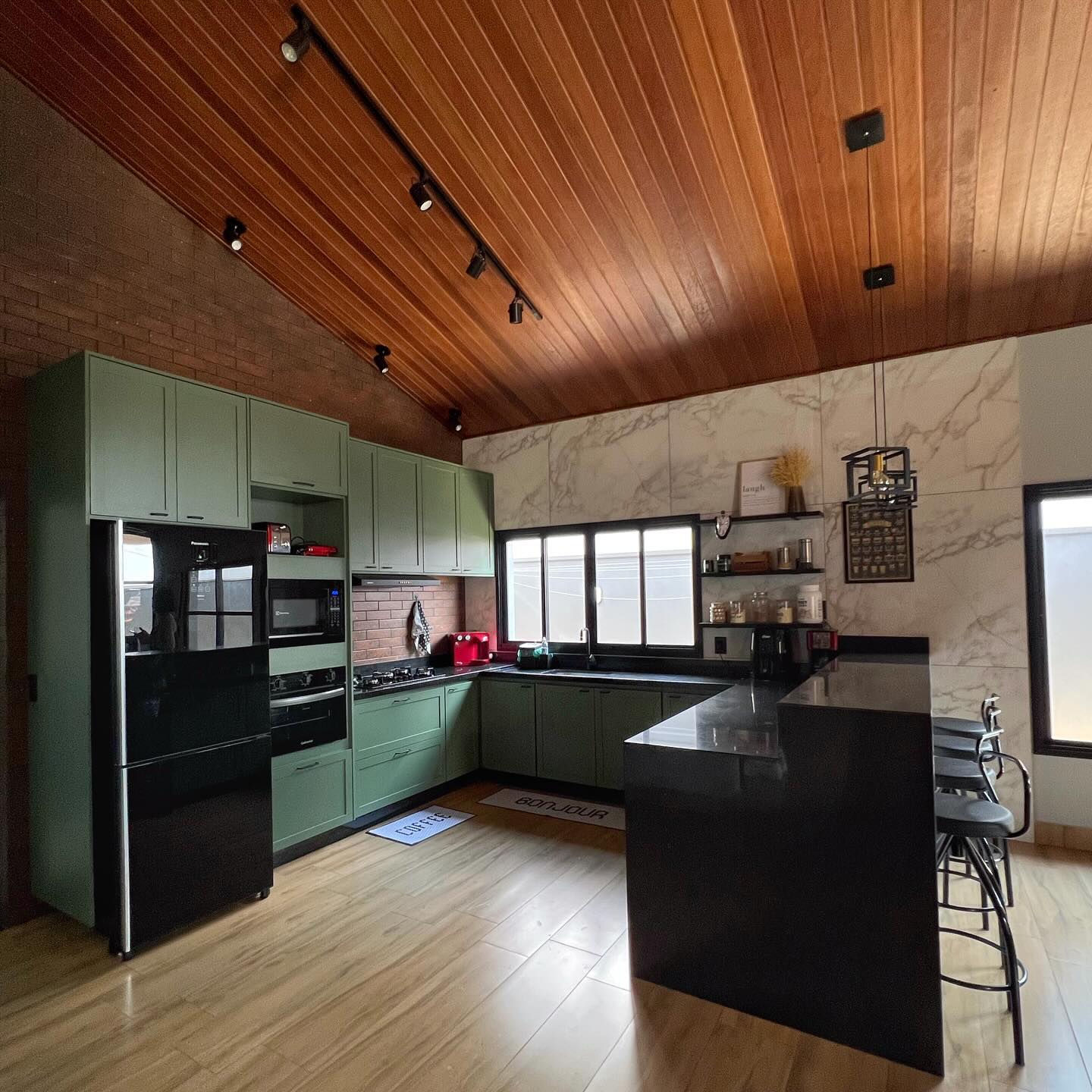Cozinha no estilo americano, com forro de madeira, tons terrosos e iluminação aparente.